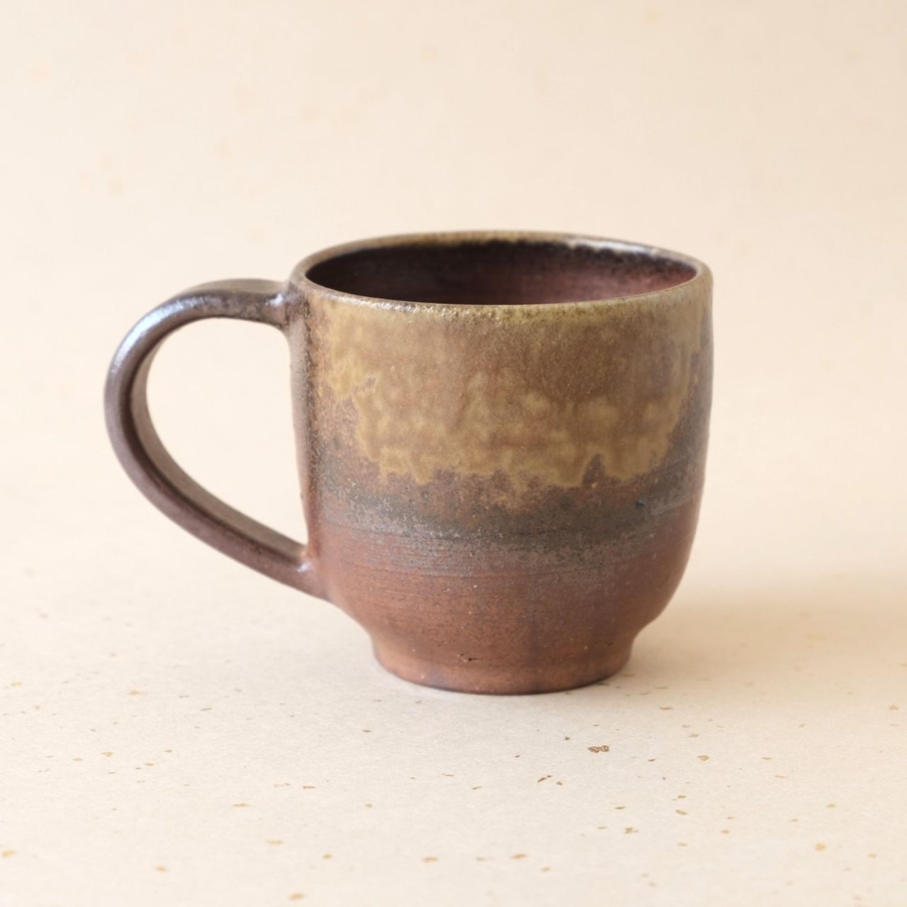 標準サイズのマグです。普段使いとしてもさまざまな用途でご使用いただけます。うつわの側面には、燃料である松割木の灰が溶け、黄味がかった色合いが現れています。