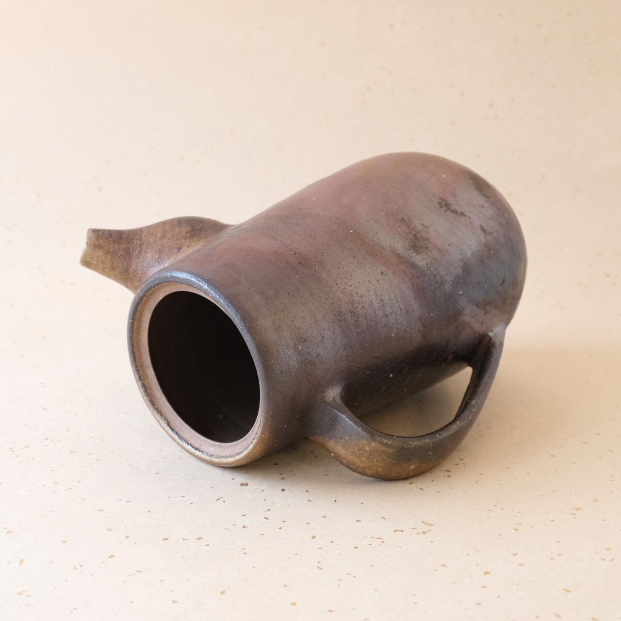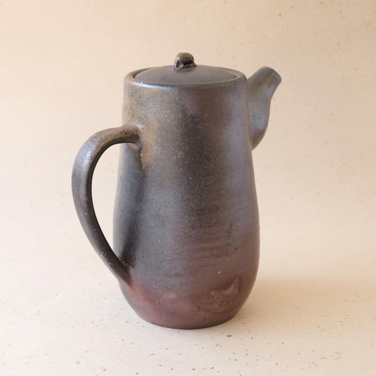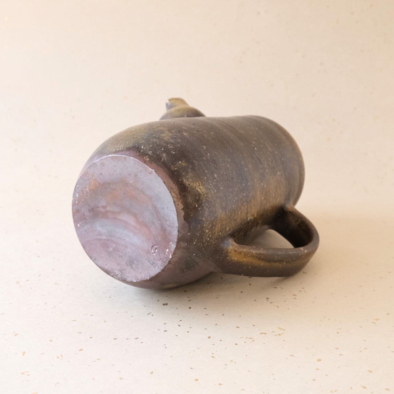 取っ手が後ろにあるフタ付きの水注で、飲み物との相性も抜群です。木炭のガスの影響を受け、全体にさまざまな変化が生まれています。