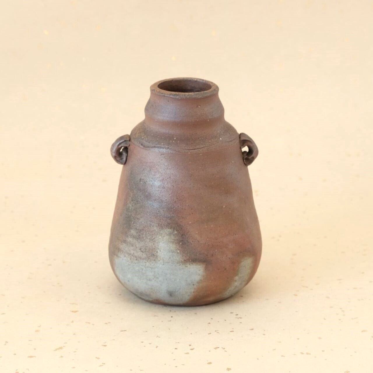 上部に耳のような装飾を施した小型の花入です。窯の火を止める直前に、作品の周りへ木炭を振りかけることにより、ガスの作用を受け、青みがかった表情が生まれています。