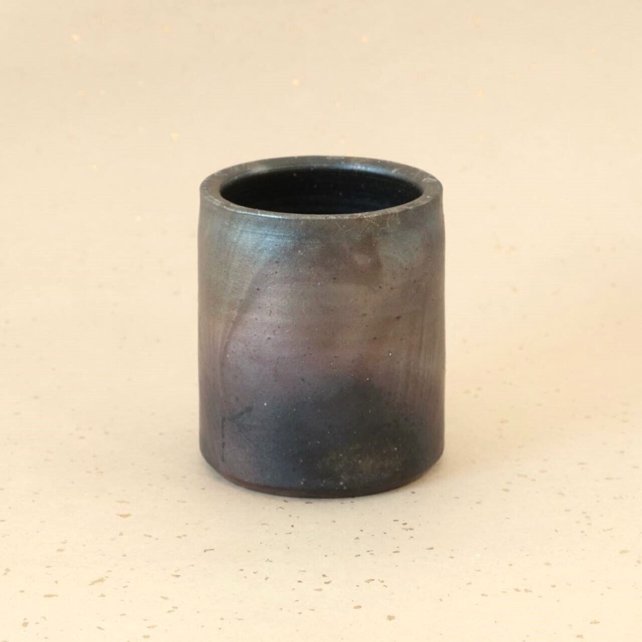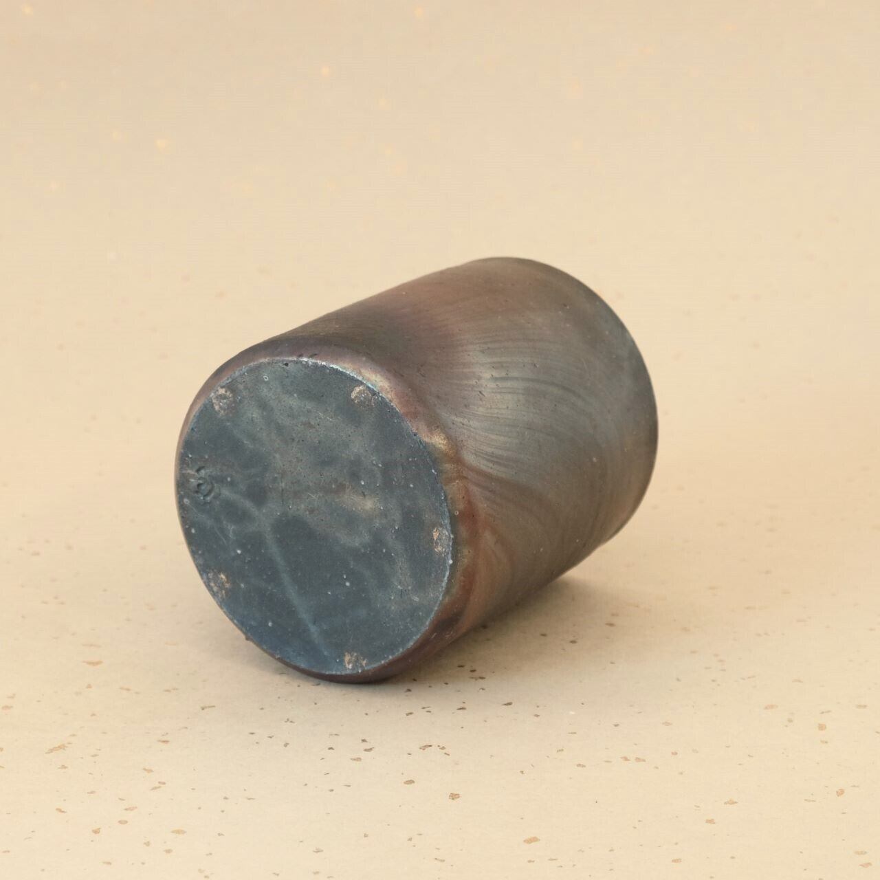 シンプルなデザインの小型花入です。窯の火を止める直前に、作品の周りへ木炭を振りかけることにより、ガスの作用を受け、青みがかった表情が生まれています。