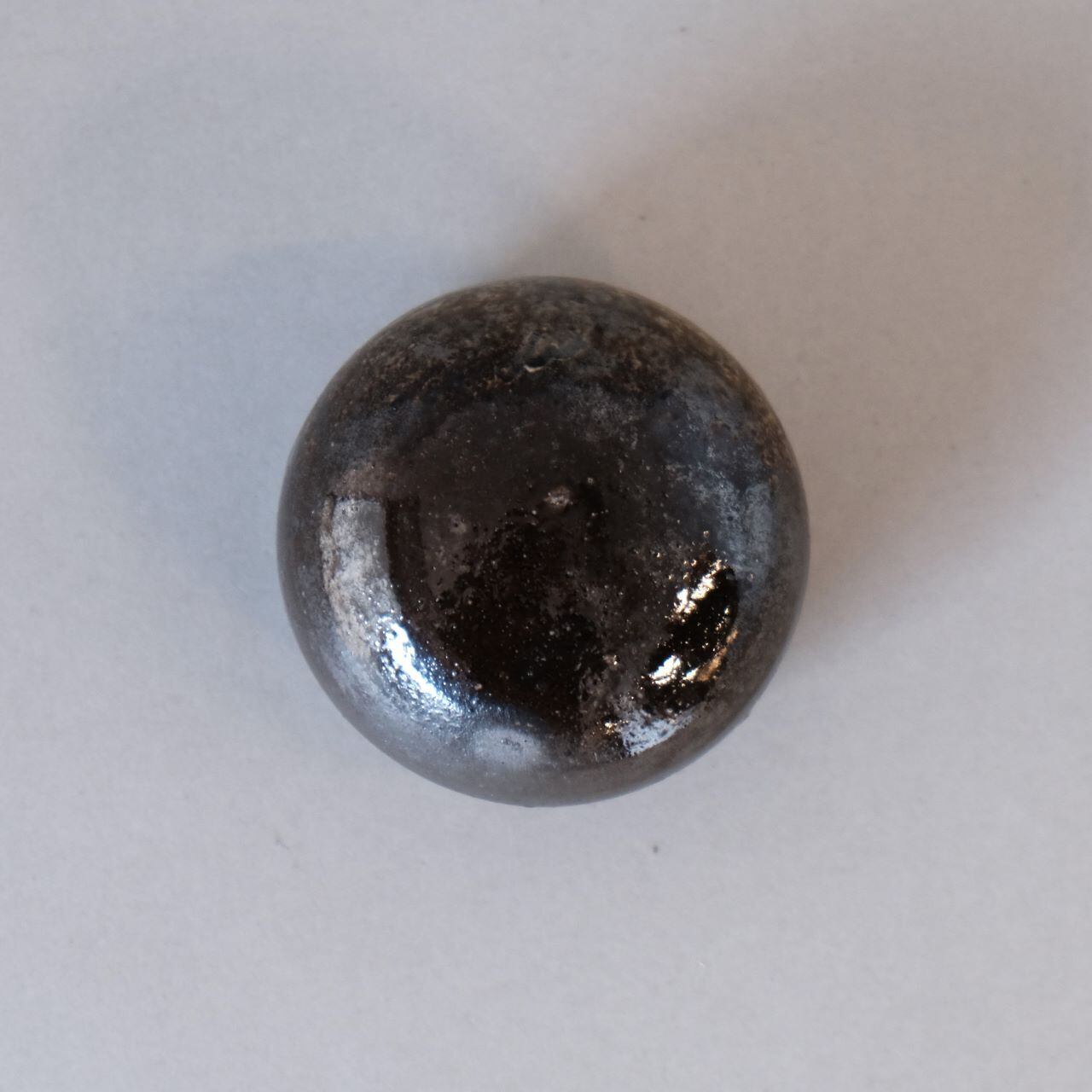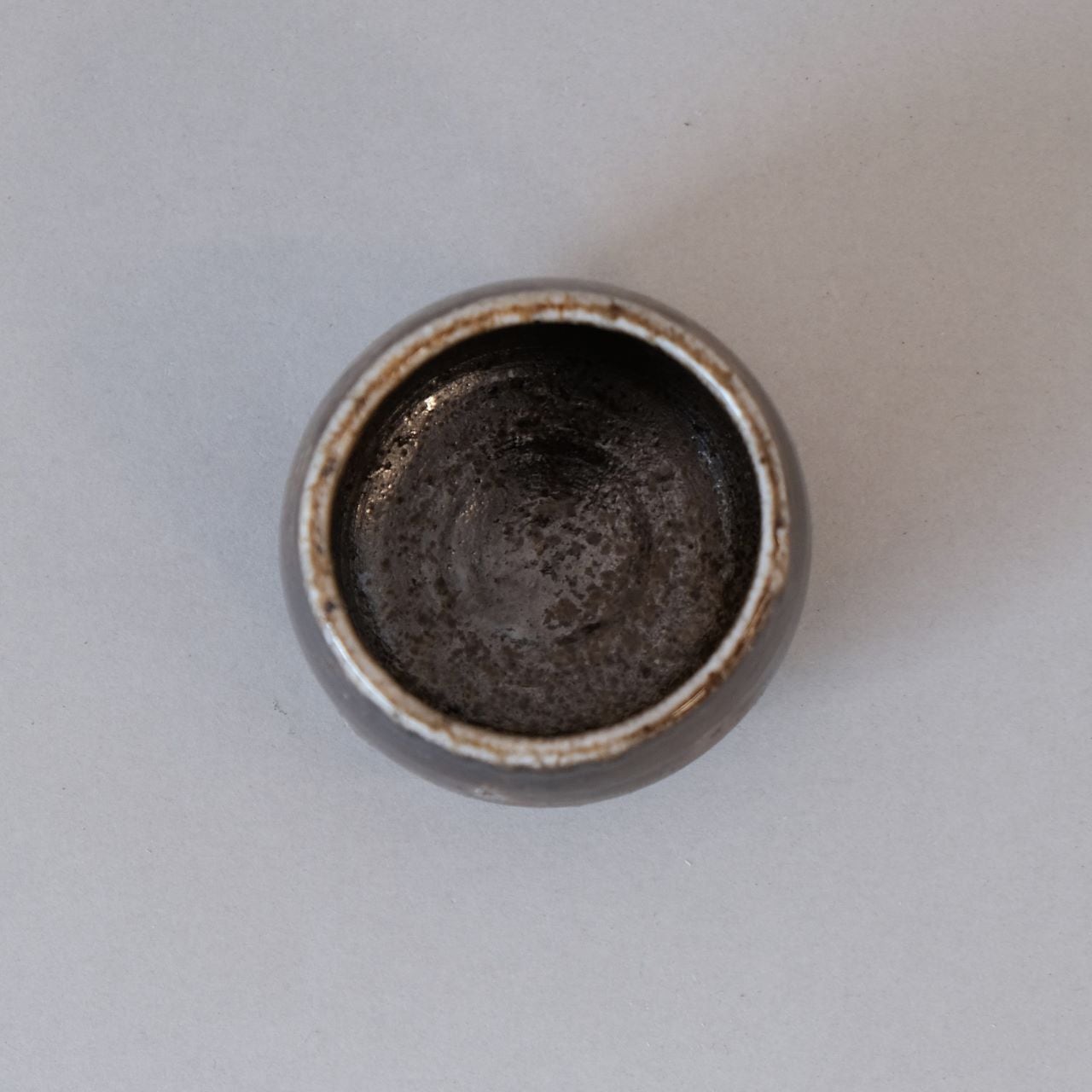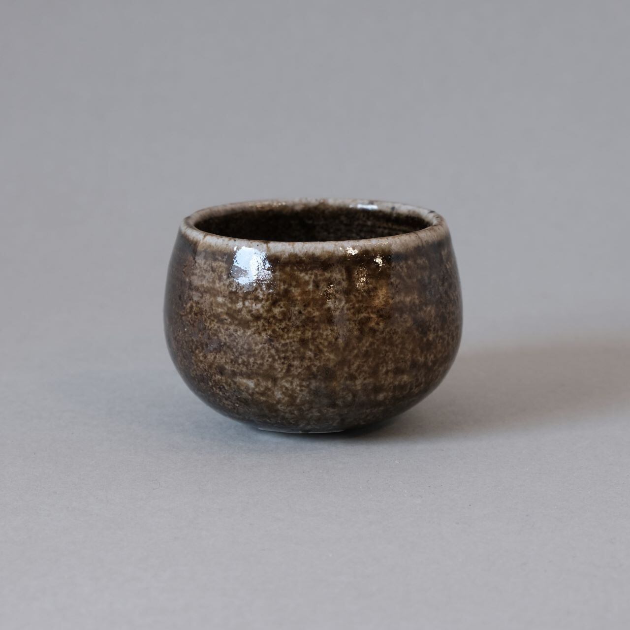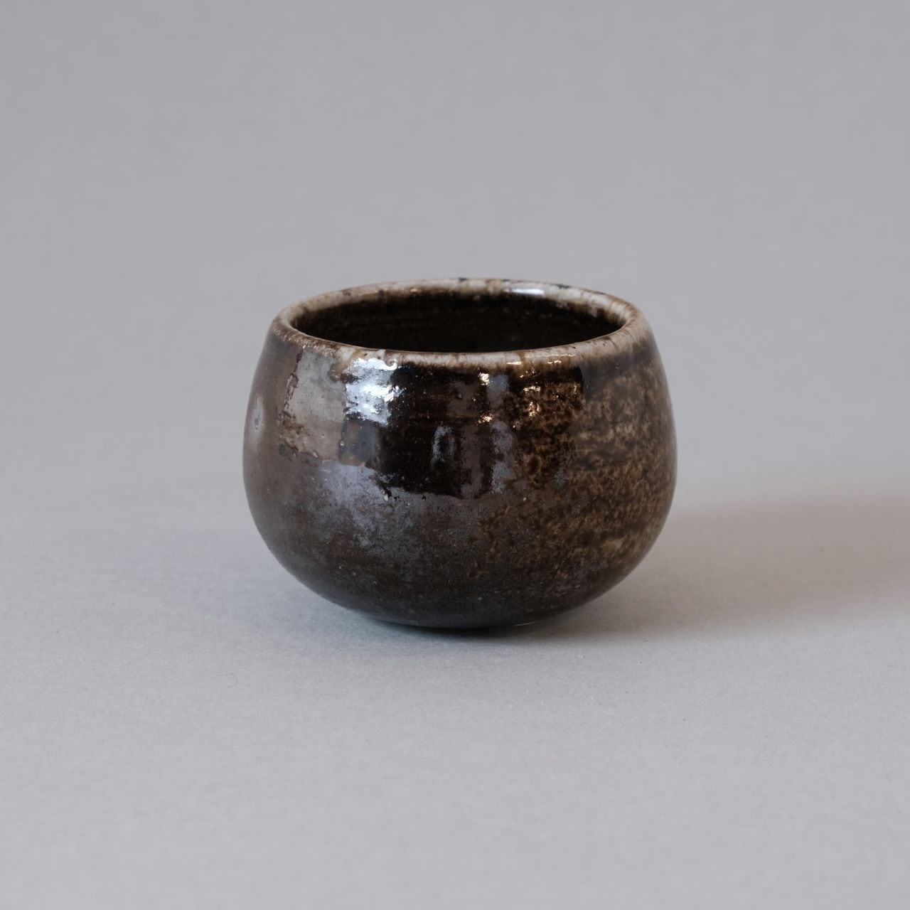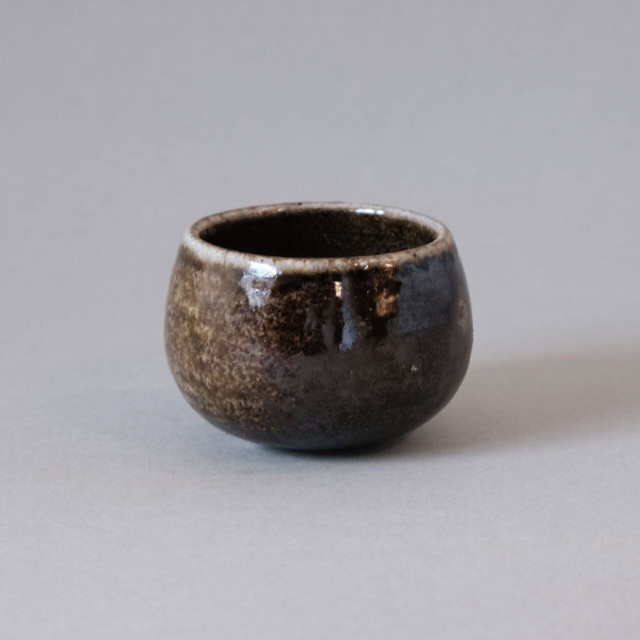 ゆらゆらと揺れるぐい呑です。焼成中の作品を窯の中から引き出すことで、独特の光沢のある黒い作品に仕上がっています。